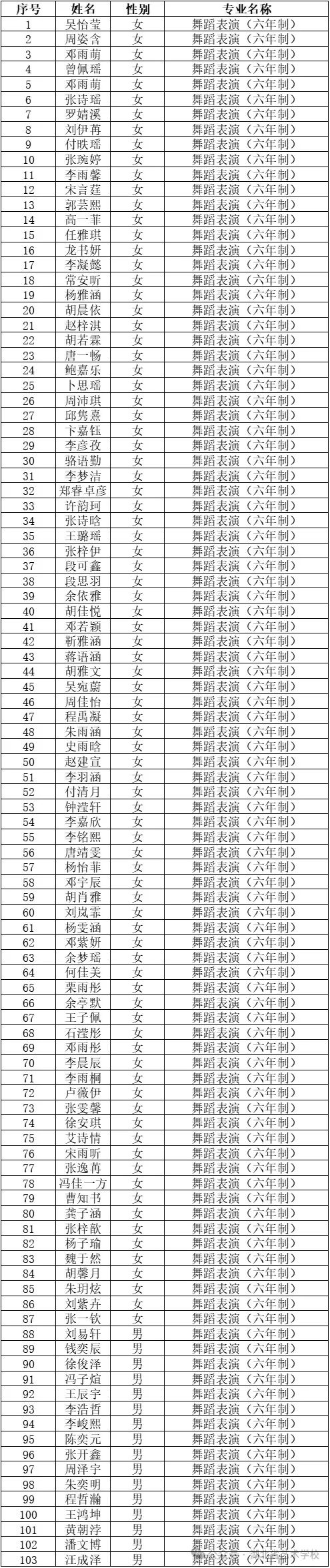 湖北省艺术学校2024年舞蹈表演(六年制)拟录取名单