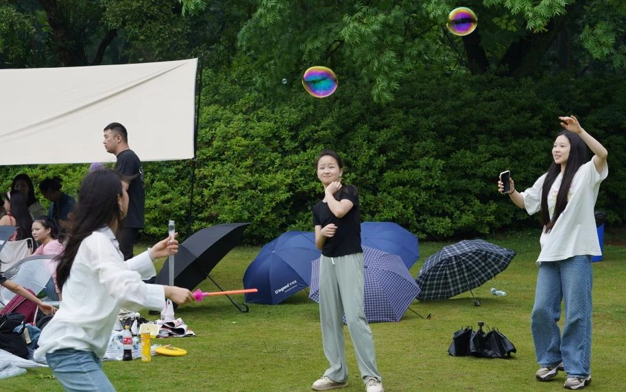 自由活动时,同学们有的聚在草地上开心玩耍,有的结伴体验磨山欢乐丛林的游乐项目,有的互相帮助补妆、拍照打卡,还有的一起分享各自携带的美食,他们又找到了另一份惬意与满足。在陪伴与分享中,我们看到了孩子们的友谊与成长,也发现了促进学生身心健康的新动能。
